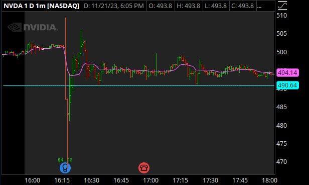 Nvidia is trading down after the earnings release, it did swing to the $510 area before dropping to the $470 area on thin post close trading. Currently its $493 down over $6: