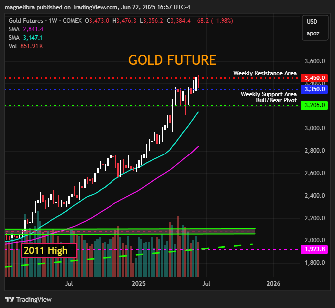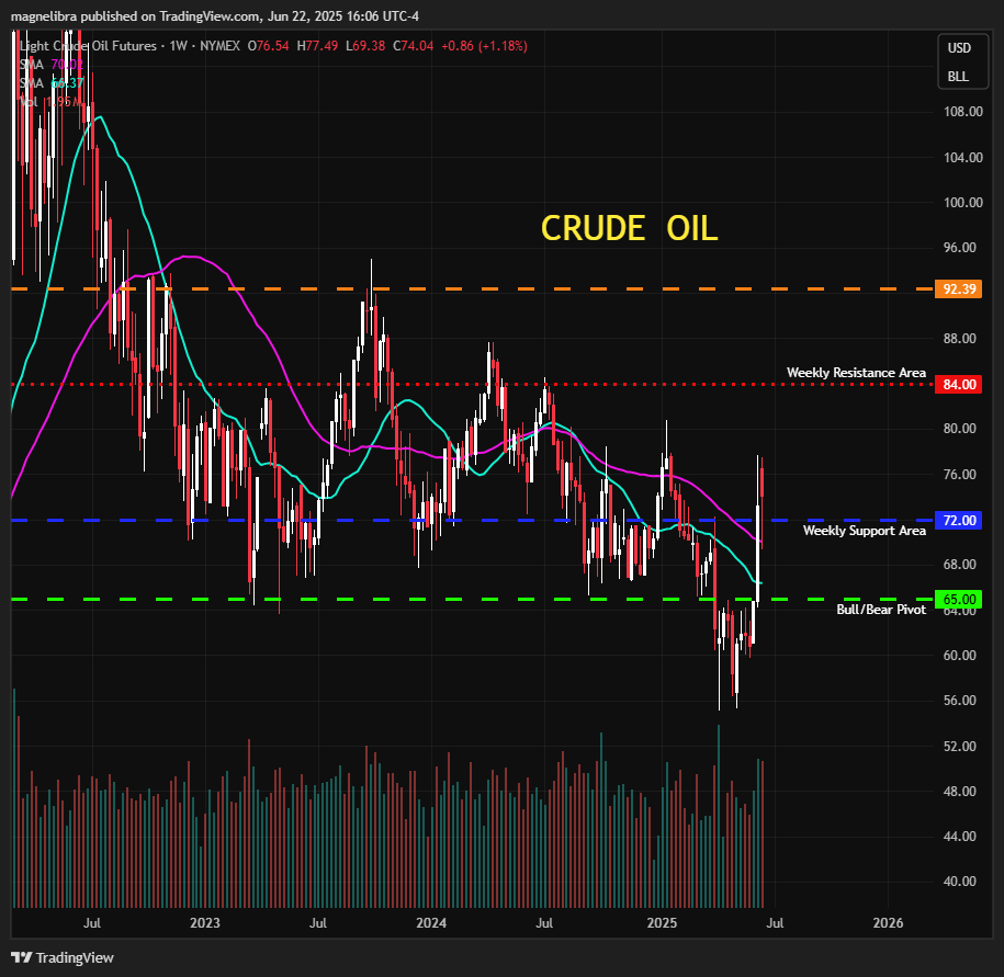 So we await the futures markets open, but for now, we expect a pretty decent volatility spike. As far as Oil, well August Crude we suspect $84 to offer our first resistance backed up by $92 area. First support will be down at $72. The initial spike will most likely be held at bay by hedgers and fast money, but suspect incoming data every day will be the focal point for traders direction. If Iran escalates then expect higher prices if not, then expect Oil to trend back down to supports: