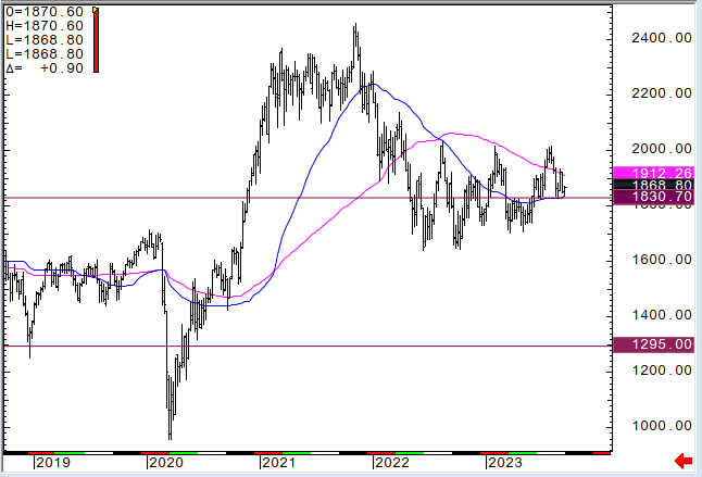 We don’t often comment on the Russell2k Index as its been such a laggard, however we are starting to see signs of holding up here. Now of course the broader market has not kept up with our MEGA8s, but something about this chart tells us that diversification may begin here into these beleaguered sectors of value. What we like about this chart and mind you this is Sept. contract is that the baseline support to us is clear, that is 1831 area, translated into the Dec. contract would be about 1850 area: