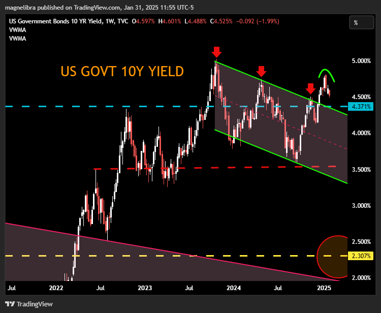 Ok lets look at the US bond market, here is the US Govt 10Y which is desperately trying to roll over and move to a more lower yields trajectory. We like the pattern technically and it does look like a move below 4.37% would add to a nice bull case for bond prices to rise and yields to fall: