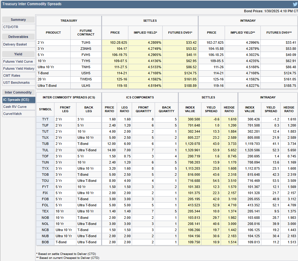 We also wanted to share this CME Group InterCommodity bond market spread data. This is an important tool for bond traders because what it shows is that it gives you the appropriate spread sizing, which is based off of each contracts Dollar Value of 1 Basis Point or DV01. Now this is not for your novice type trader, but this data is integral for anyone using bond spreads or trading bonds to understand the contract differentials. One could get into a lot of trouble by trading these products and not understanding these values. So we wanted to share this data for our viewers and listeners: