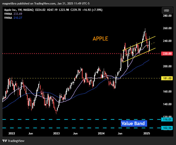 This weeks range in Apple is consistent with its higher trend channel that it has been carving now for over 7 months: