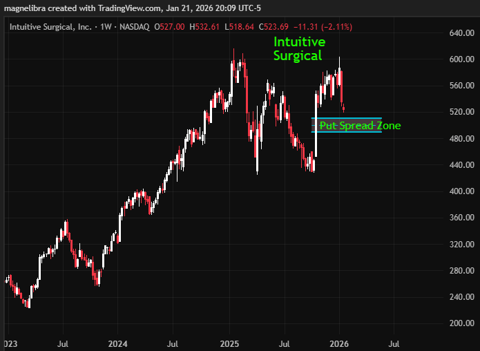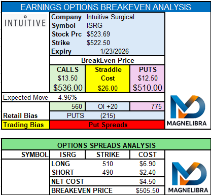 When we look at the options straddle for ISRG and Friday’s expiration they are looking for a 4.96% move with the $522.50 strike straddle pricing at around $26.00. This stock does move and owning the straddle does generally provide a decent risk reward setup. We also would prefer more risk taking types to own puts or more specifically take a look at buying the 510/490 put spread for a total cost of $4.50 as shown in our data below. This comes with a breakeven price or move toward the $505.50 area: