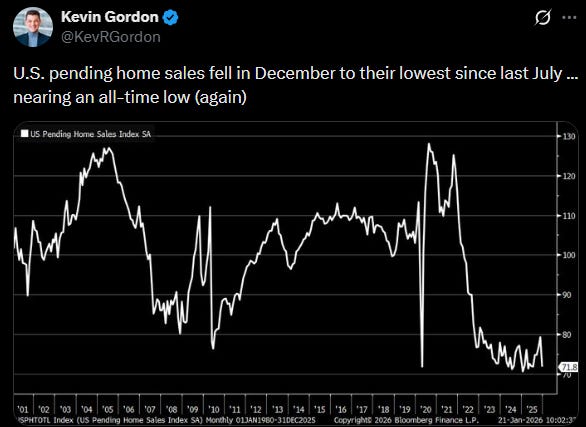 We saw Kevin Gordon post this pending home sales data chart and you can see how the post covid overhang continues to plague the housing market. A combination of abundant supply, higher mortgage rates and abysmal affordability are the driving forces behind these abysmal numbers. We do not see this getting better anytime soon, in fact, we believe it will get much worse and force pricing pressures to finally submit to this new reality. We believe all that “equity” homeowners believe they are sitting on are going to be discounted down in the coming years: