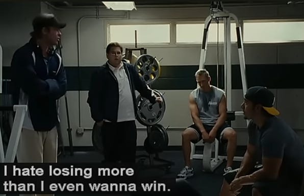 I hate losing, I hate it, I hate it more than I even wanna win, and there’s a difference! -Brad Pitt Moneyball 2011