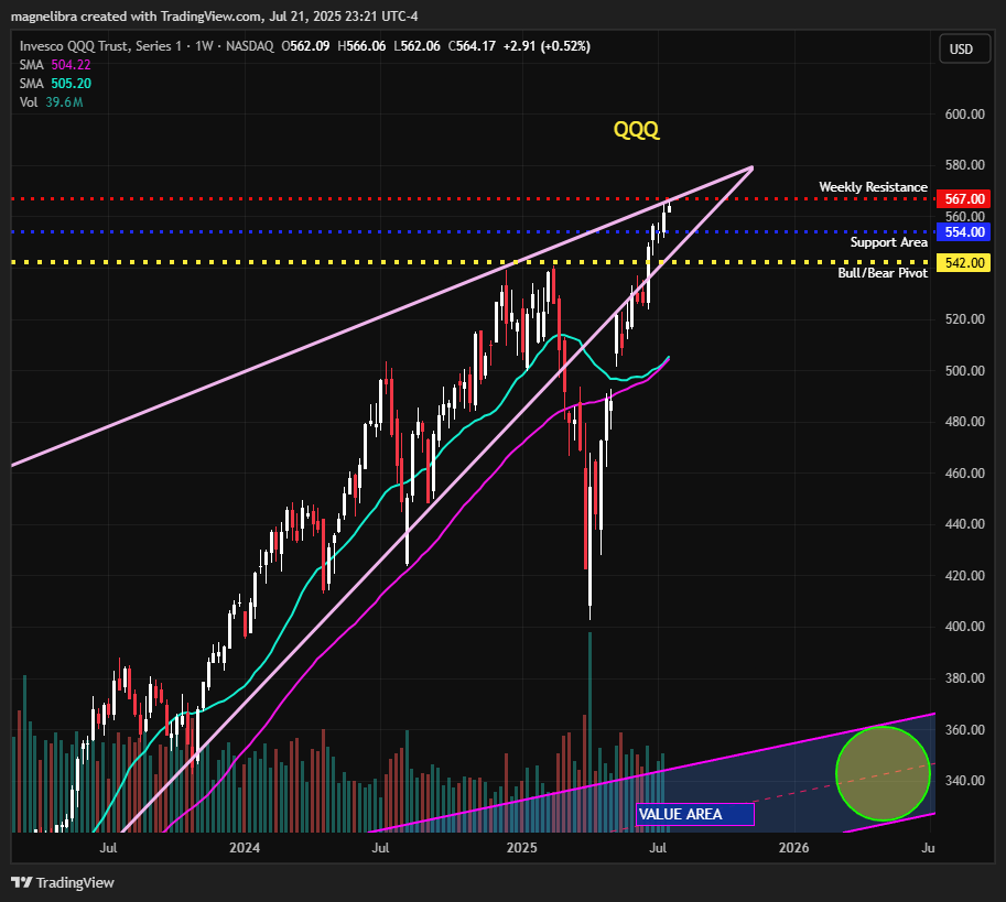 When we look at the QQQs they are pushing into extreme wedge resistance and it will be interesting to see if we get a pop out of this wedge to then see a move right back down into. 567 is key upside resistance this week:
