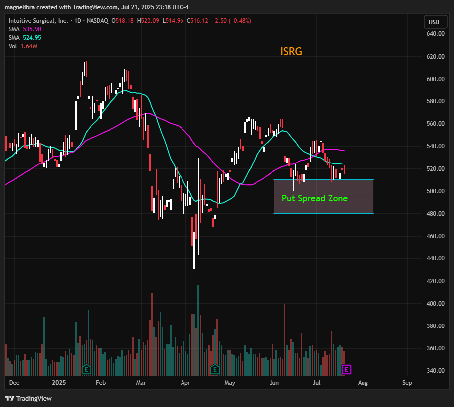 From our post earlier today, our early focus is on Intuitive Surgical, the moving average cross here is what’s leading us toward put structures for the earnings. The options straddles are looking for a 6.7% move or 35 points. We are targeting the 7/25 expiry $510/$480 put spread which can be bought for 9.25, so risking 9.25 to make 20.75 for a 2.24x risk reward structure. Take a look at the chart, we know this stock is a retail and institutional favorite but technically, it seems set up for a down move: