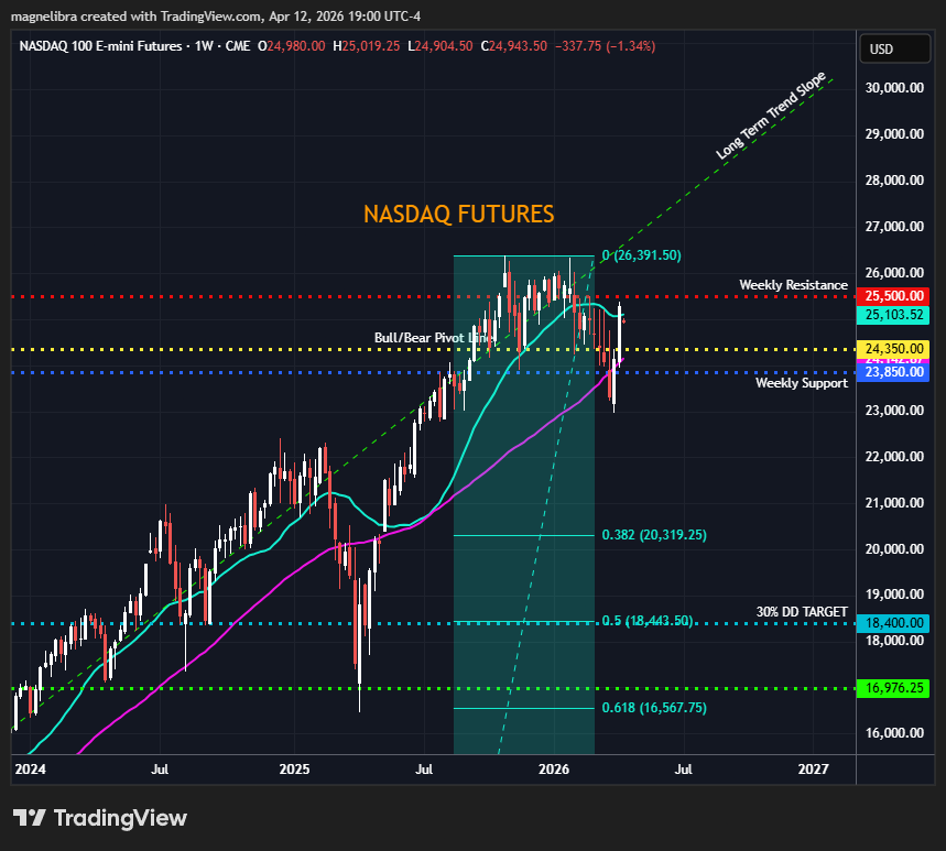 Same idea in the Nasdaq futures 24350 is key and we suspect the bears will test that with the 23850 level below that as key weekly support: