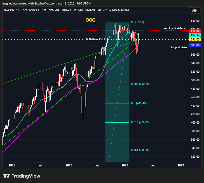 This week the QQQs will have 596 as the focus to stay above for the bulls. The large back to back weekly candles seem like reactionary moves to the middle east outcomes and are driven by CTA trend followers adding to positions, but that sentiment does change quickly if the prior two weeks moves are negated, CTA trend followers will move to net sellers not buyers: