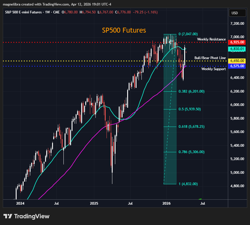 This week for the SP500 futures we believe the bull move last week will be tested for its legitimacy and that 6925 is the upside target for the bulls while the bears will try to pressure the market back below our bull/bear pivot line down at 6650: