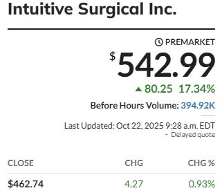 As far as ISRG, well the opposite move there as sales were +23% smashing expectations there and ISRG +17.3% in after hours trading: