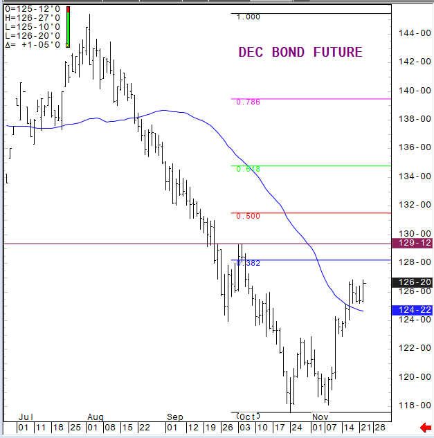 Subscribers, we are anticipating shortened coverage this week due to the Thanksgiving Holiday. We just wanted to touch base here quickly and give a quick look at some of the markets that we are interested in and our sentiment. As you know we looked at the US bond market last week and we truly do feel that higher in price is the path of least resistance. This week has started off with the long end leading the way. Here is the Dec Bond Future: