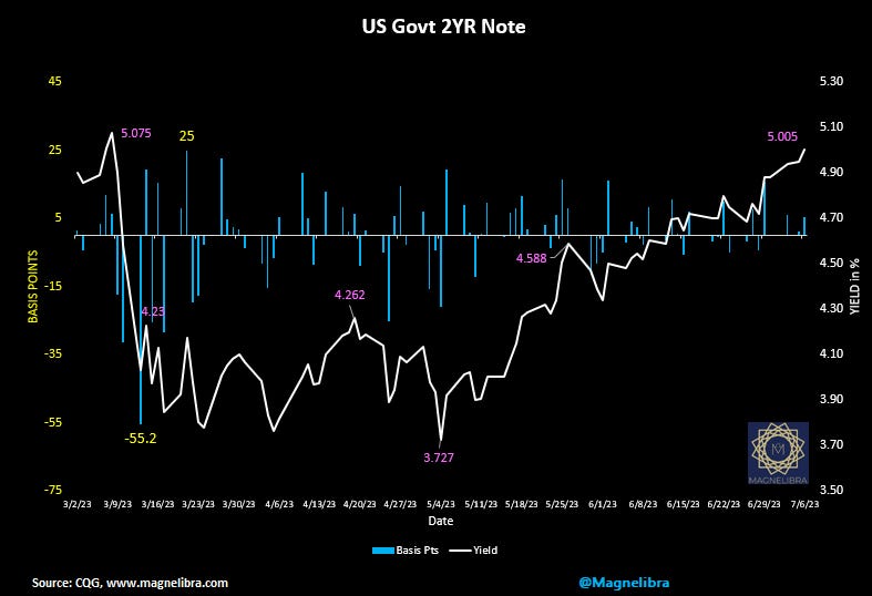 Non Farm Payrolls came in at 209k lower than the expected 231k, but the bigger data was in all of the prints for 2023, have been revised lower. April and May combined revisions saw 110k removed from their respective headline totals. We are awaiting for the first negative NFP print and that will usher in the reversal of yield curve flattening and begin the steady march back to positive sloping yield curves.