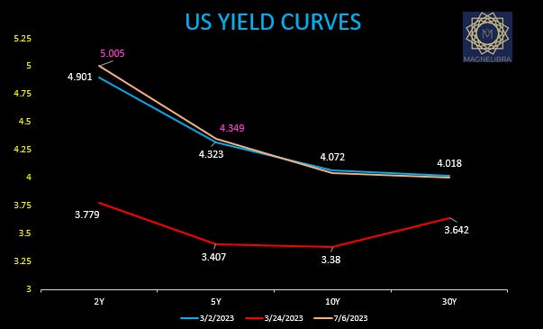 We can see here that the US Yield curves have flattened back below the pre bank crisis earlier this year as the 2Y5Y spread is -65.6bp: