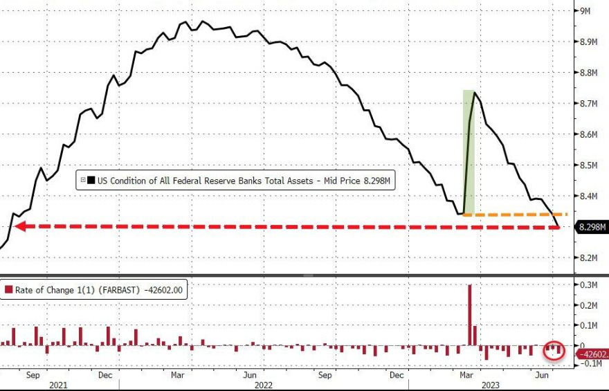 Ok in other data, late yesterday saw the FED H4 report which saw the FRB balance sheet decline $42.6Bn now below $8.3T for the first time in over 2 years. This $600Bn reduction is just 6.67%: