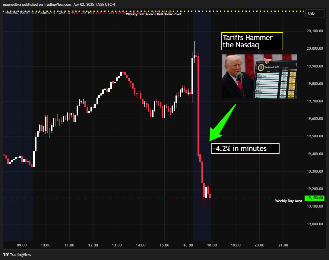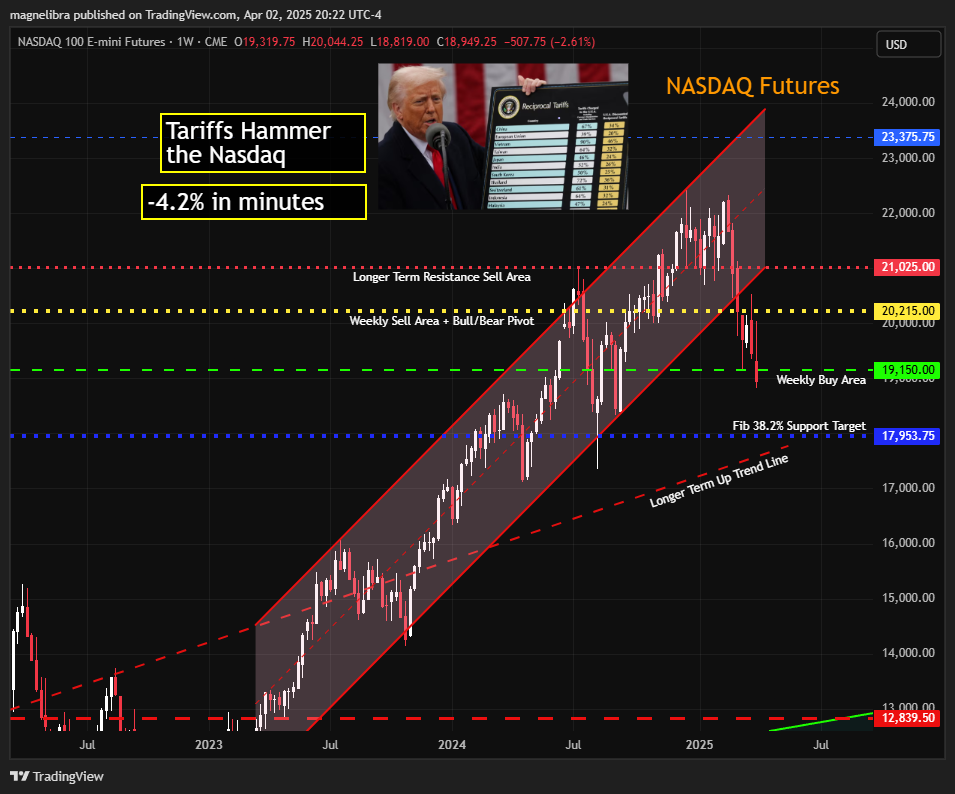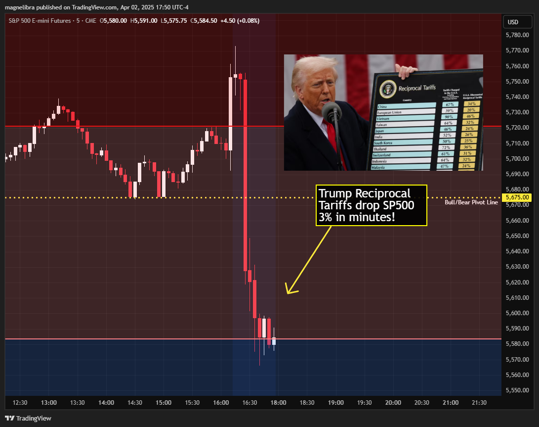 Trumps Reciprocal Tariffs drops the SP500 -3% in minutes and the Nasdaq -4%…as we have been saying all along, Trumps Pro-American agenda is firmly in place. Something tells me the FOMC is in the cross hairs here and if lower rates are indeed the goal, I would expect a much weaker US economy and US dollar for that matter ahead. This also means nominal asset prices are going to see big big discounts here as global trade and geopolitical posturing makes its way through global asset prices. Expect volatility to continue day to day: