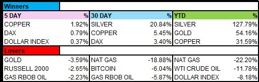 Silver, Gold and Copper take the top 3 spots for returns in 2025, +127.8%, +54.2% and +31.6% respectively.