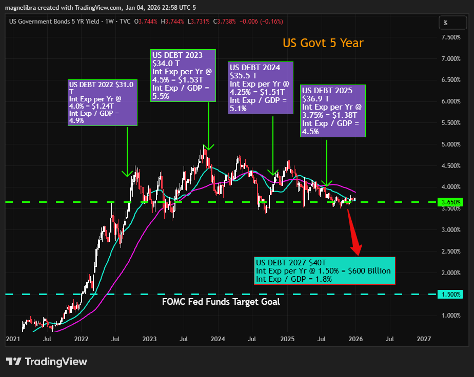 Here is our US Govt 5 Year chart, where we show the average US Govt debt costs at their respective average interest rates. Our chart highlights our target FOMC Fed Funds rate by the end of 2027 to be 1.5%. The 3.65% yield level once broken should usher in the next wave down: