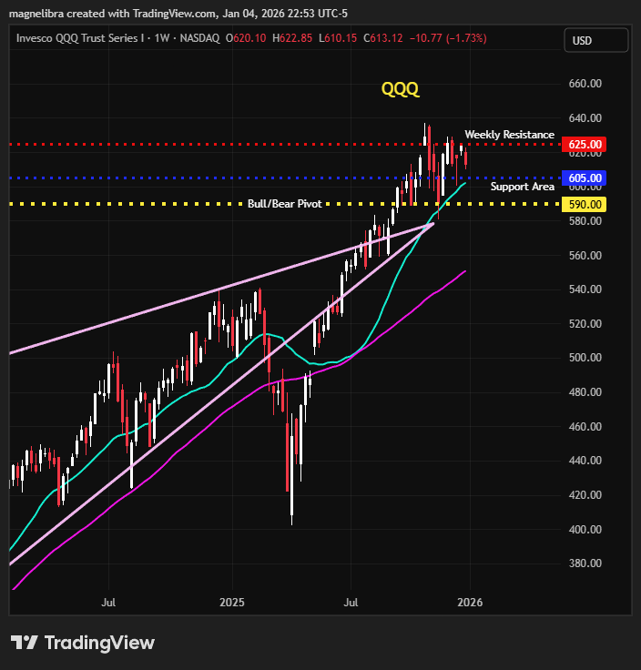 Ok let’s take a look at the QQQ ETF for this weeks support resistance levels: