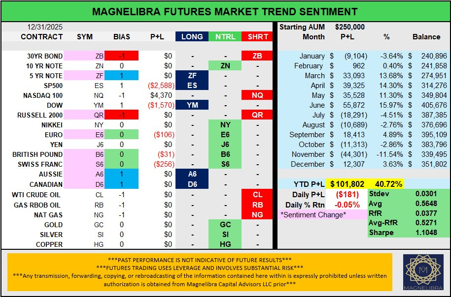 Magnelibra CTA Futures Market Trend Sentiment (Our proprietary commodity trading advisory futures market sentiment long/neutral/short market flows indicator) The portfolio is made up of the core futures markets we cover and the indicators are for single contracts of the futures market, whether long, short or zero neutral. The P+L is generated via the starting daily position and the ending daily settlement. This is considered a high risk alternative strategy. However most investors should leave a portion of their overall portfolio within a high risk basket. Some of the percentages of the overall portfolio dedicated to high risk should vary from 3% to 18% depending on ones overall time to invest and risk profiles. We added the Sharpe to our data now as well for those quantitative types!