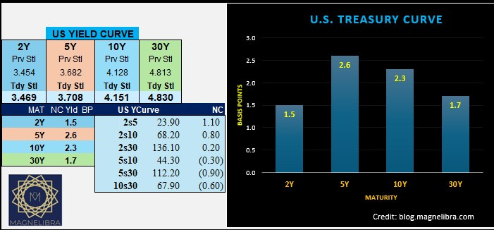 The U.S. Bond Yield Curve (This is our daily graphic displaying the U.S. bond market yield curve changes. We follow the 2 year thru 30 year durations. Please note that bond prices work inversely to yield changes so for instance if bond prices are rising and moving upward, then their yields are falling or moving downward. We also track the relationship between the durations known as US Yield Curve Spreads, when we list it as 2s5, we are comparing the yield differential between the 2 year vs the 5 year with the positive/negative viewed from the higher durations perspective.