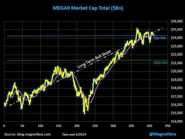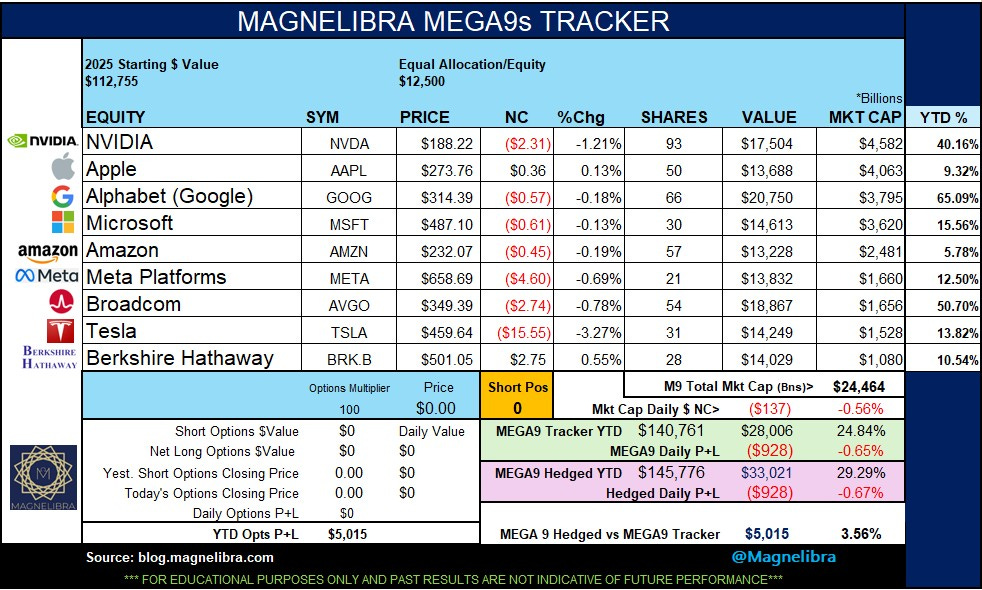 Magnelibra MEGA9s Portfolio Tracker (This is a synthetic long only portfolio of the Top 9 largest equities by market cap. We started this tracker because we understand Ai dominates the investment landscape and operates in a binary construct. What we mean is that it issues a buy or a sell and will do so in reinforcing mechanisms, meaning if alpha is rising it will add, if it is falling it well sell and remove. We also created a “hedge” for those that want a more active approach to tactically maximizing their long only static portfolio of equities)