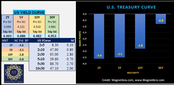 The U.S. bond market, saw the front end outperform yesterday and a bull steepening, which is expected when yields move lower. This is the case because the anticipation is for the FOMC to err on the side of caution and restart cutting rates. If the FOMC does indeed restart rate cuts, we would expect the yield curves to really steepen out.