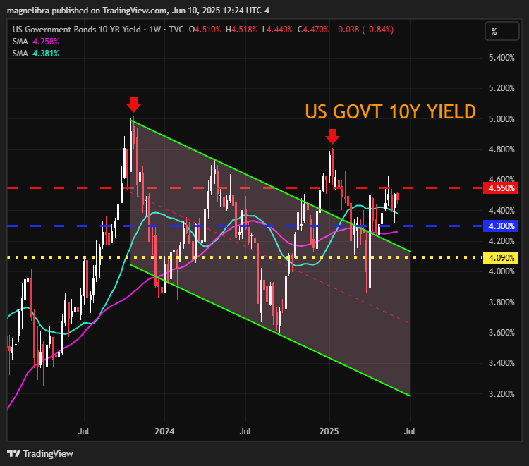 Ok let’s take a quick look at the US Govt 10y yield chart this weeks resistance is set at 4.55% with support at 4.30%: