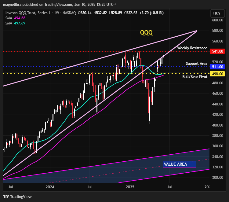 Taking a look at some other technical charts, the QQQ ETF continues to push into the highs with resistance up at 541 and support down at 511 this week. The QQQ is starting to push into the prior trend wedge, which a weekly close inside, would target new all time highs: