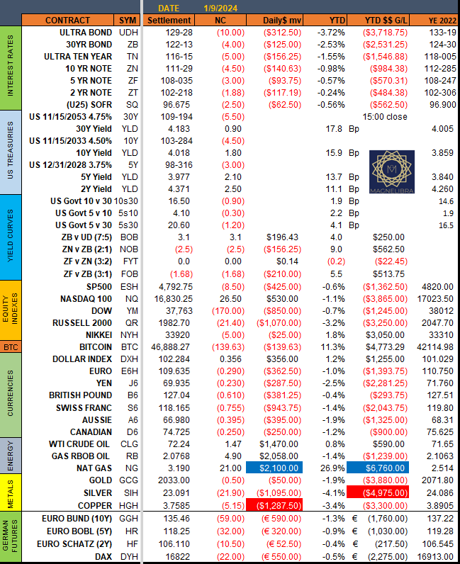 Ok onto our subscriber settlements and trackers. First up the settles from yesterday, kind of a muted day honestly with bond prices falling slightly, equities lower mostly with the Nasdaq up slightly, the US dollar was stronger against all majors, metals were all lower and the energy group was the best performer with Nat Gas continuing its run. We like Nat Gas here but would not chase this into highs, for those looking to go long, we prefer patience and a move back under 3.00 and even more so near 2.80: