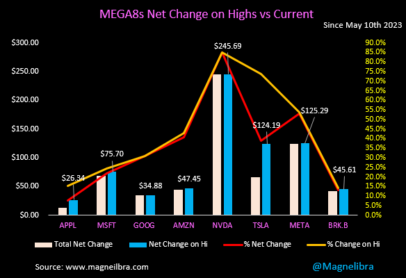 When we look at the MEGA8s performance since 5/10/23 its obvious that Nvidia continues to be the standout making new market cap highs with Google and Meta holding up very well also. Tesla continues to be the weak link of this group. This chart displays the net dollar change (not market cap) vs their high net dollar change since May 10th 2023: