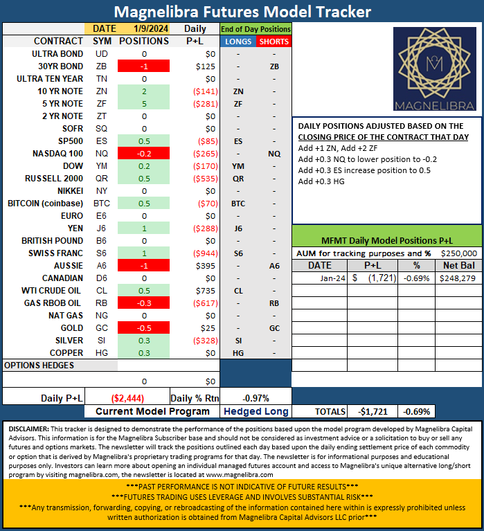 We do have a few changes to the Futures Model Tracker as of the close yesterday and we do apologize this is coming out late. We added a Ten and 2 Fives to the bond portion, we reduced the Nasdaq short by 0.3, we added to the SP by 0.3 and added 0.3 in copper. We like Nat Gas but will not buy into the strength here, will await for profit takers to drive it near 2.85 to set any long positions: