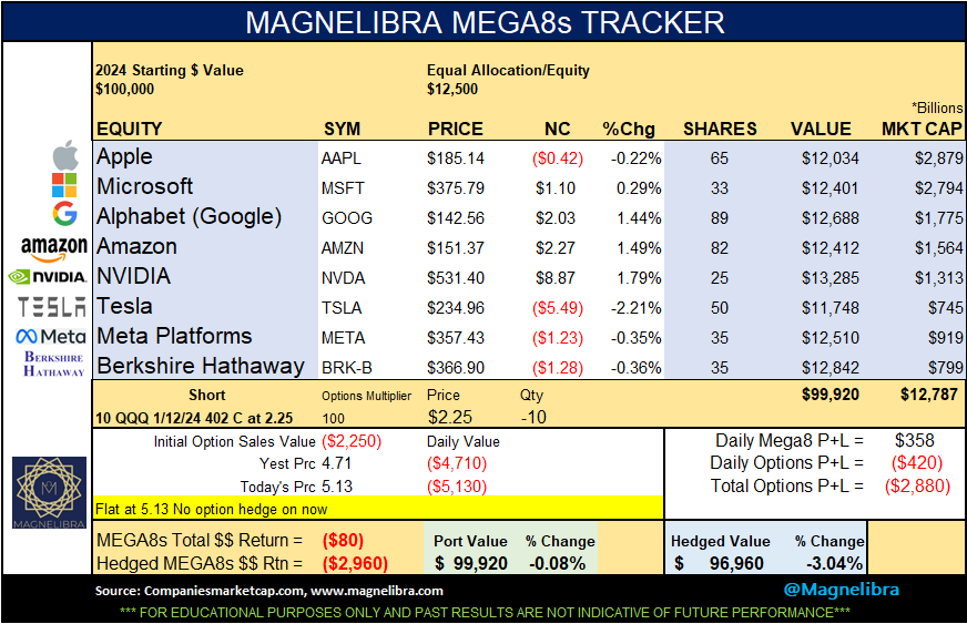 When we look at our MEGA8s Nvidia continues to forge ahead and all those late to the party continue to hope for a 2024 resurgence. The tracker also closed out the option hedge at 5.13 so no hedge on for now. With CPI and PPI we suspect we will get some volatility and that hedge may be too costly vs the overall package at this point:
