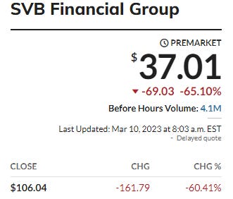 SVB Financial Group continues to get pounded overnight down 65%!