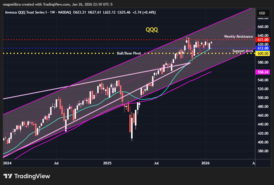 Let’s hop over to the QQQ ETF, where the Qs haven’t move really since October and 631 is our resistance area this week with support down at 612: