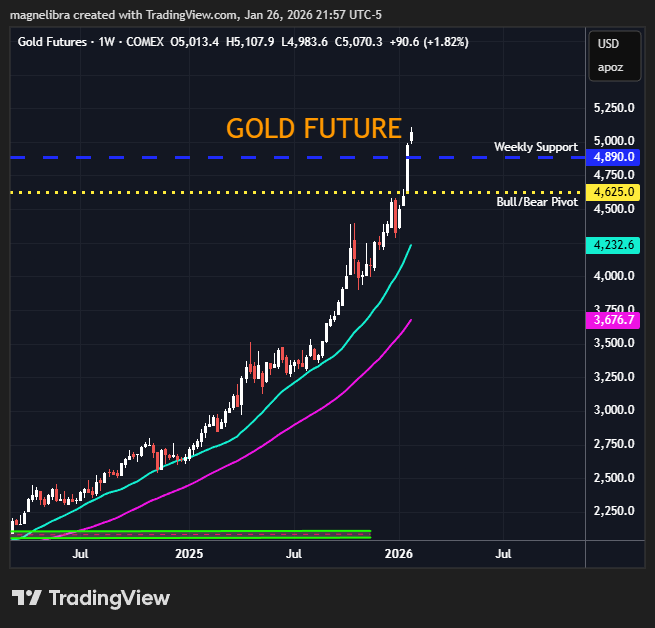 Initial weekly support in the April contract comes in at $4926 and the bull bear pivot is at $4661, obviously we offer no resistance. The Feb to April roll spread was -$36 so when we look at this Feb Gold weekly chart below, we can extrapolate our supports and bull/bear pivots by adding $36 to these levels: