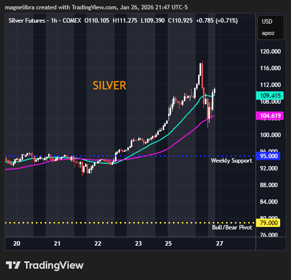 Silver put in a massive daily candle today running up toward $118 then spending most of the afternoon in sell mode, pushing the contract to the low of the day down at $101.70. However Asia’s open tonight is seeing buyers emerge once again, in a theme that we believe may still have more room to run. The global central banks and the world powers seem to be playing real money games here and the mad dash for physical treasury assets such as gold and silver seems to continue on unabated. If the United States is going to keep racking up the debt pile, well China seems to be trying to get ahead of all this debasement. Anyway let’s look at the Silver futures hourly chart: