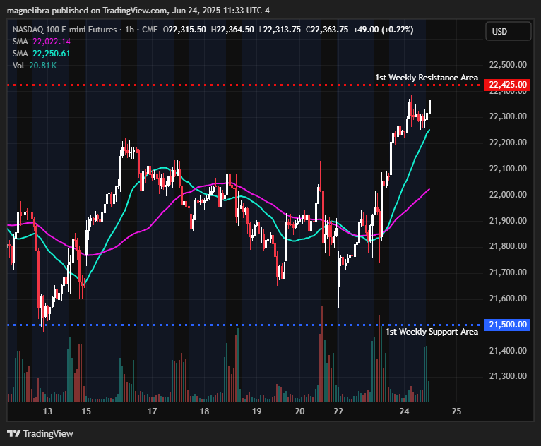 As far as the Nasdaq futures 22425 is key weekly resistance and on the hourly chart the bulls continue to press here, but we may see consolidation here before the next attack on the 22425 area, bears will want to push the 21pSMA as well and that is down at 22250 so that will become our initial support backed up by 21500: