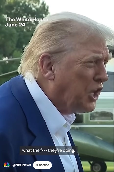 So this morning we see Trump who orchestrated a cease fire to only have both Israel and Iran violate it immediately. His response this morning was great, classic Trump,