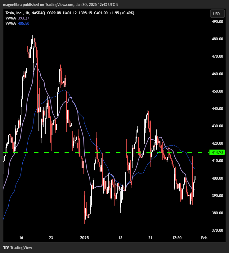 So with those central bank decisions we know the big deal yesterday was the earnings reports from the tech giants, let’s see just how everything washed out and is being reflected in today’s action. First up Tesla missed estimates across the board, it missed on the revenue, operating income, gross margin, and EPS prints as a result initially TESLA did jump after hours and is holding steady right now +$12 +3.5% on the day and we still believe $414 is the resistance area that will cap it for now with $380 downside support: