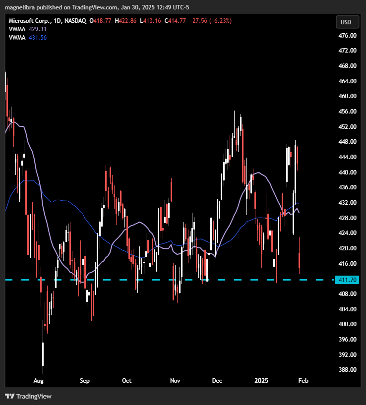 Next lets look at Microsoft who did beat both top and bottom lines Revenue and EPS, but it seems the cloud sector did falter and didn’t meet expectations and this hit the stock 5% immediately. Yesterday’s post highlighted the $440/$430 put spread for $3.40 which offered a decent 2.94x payoff and today, its well near full value with one day to go for expiration, but you could obviously take profits or buy a call to protect or do a host of other things if you went into this thing with a bearish tilt! We also highlighted the $412 area as key to overall support for the bulls going forward: