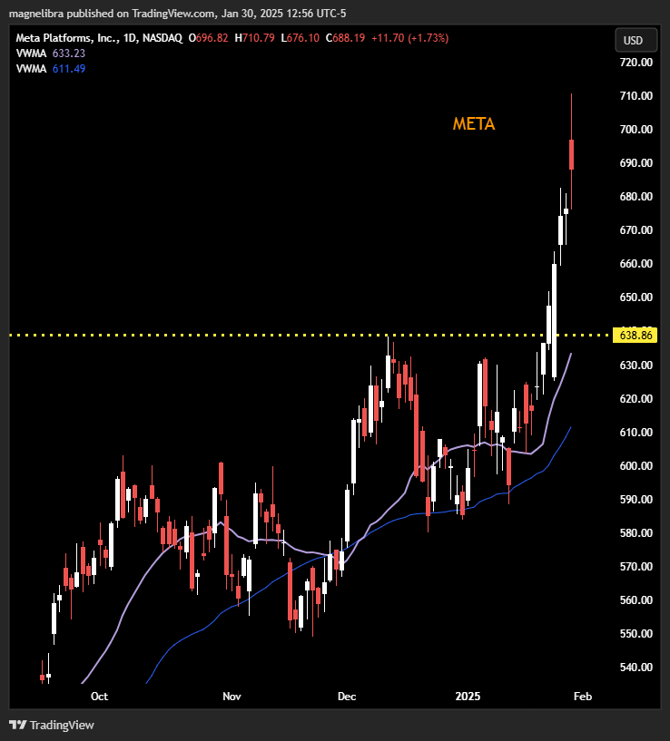 When we look at META, it easily beat estimates for both revenue and EPS however forward guidance was not as favorable. The stock is seeing decent two way flows and is currently up 1.7% or so. We like the high mark today and for tomorrow on the weekly the bulls are still easily in control and that will not flip unless the $640 area gives away: