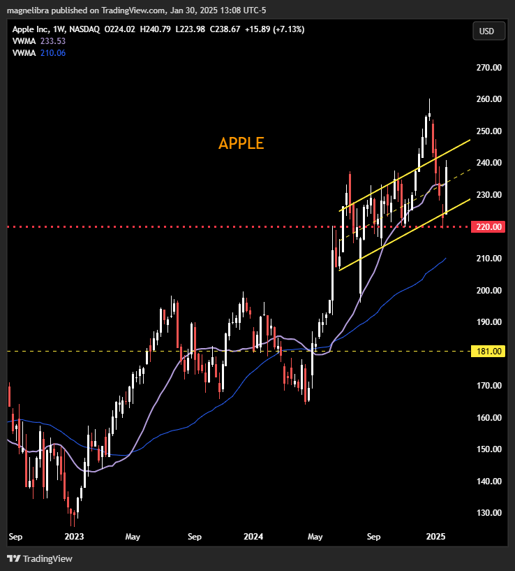 So now looking toward today Apple and Intel, lets take a look at the options markets. For Apple we will target the $237.50 strike for the break-even straddle estimates, currently the straddle is pricing in a move of $10.07 which is a move of 4.2%. $230 seems like a nice target post earnings given the supply of calls and puts and above $240 gets costly for the market makers. Apple has been on a good run here and we don’t really have an opinion either way here. The bulls are in control and only a move below $220 would change this sentiment here: