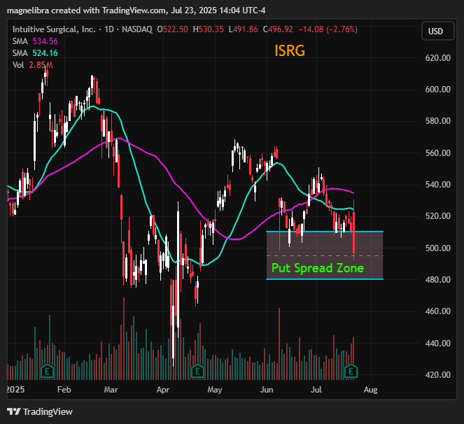 Yesterday we focused upon Intuitive Surgical (ISRG) we highlighted the 7/25 expiry $510/$480 put spread which cost $9.25, so risking 9.25 to make 20.75 for a 2.24x risk reward structure. Today ISRG is down 2.7% trading $497 and the put spread is trading $16, if you put this spread on we recommend taking off 60% of this position and letting the rest run. We have seen this same move before and a trade back to $510 area is not out of the question, so that would be our advice here if you have this on today: