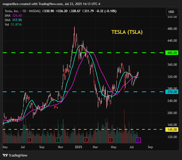 As far as after the close today, we have Tesla and Alphabet earnings. As far as Tesla, the ATM (at the money) straddle is trading around $24 indicating a 7.2% move. Tesla a bit more tilted toward the call side with decent open interest from $335 on up. As far as the puts $310 strike stands out so a trade just above there may make sense. The $330/$310 put spread is around $7.75 so risking that to make 1.58x not the best risk reward we have seen. The $335/355 call spread is priced pretty similar, so this one is a crap shoot and we wouldn’t be playing it given the profile set up. Here is the chart and we are kinda in the middle here, no mans land: