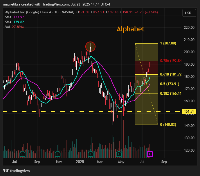 As far as Alphabet and using the GOOGL symbol, it doesn’t get any more clear technically on the chart, this is a notorious risk/reversal level on the fibs and we would be better buyers of puts here. The ATM options straddle is trading around $11.25 indicating a 5.9% move. With that and regarding our bearish sentiment, using the 8/1/25 expiration options (next week) we prefer the $187.50/$175 put spread is trading $3.75 for a risk/reward of 2.33x. We believe this offers a decent profile for our readers to review and assess for themselves: