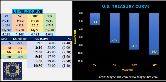Alright, I wanted to look at the US bond market as we have seem quite a resurgence here lately and its kind of running under the radar, but take a look at yesterday’s US bond market yield curve move. A hefty flattening as the 30Y bond outperformed and saw 10.4bp drop as the 2Y only fell 3.1bp flattening the 2s/30 curve by 7.3bp on the day: