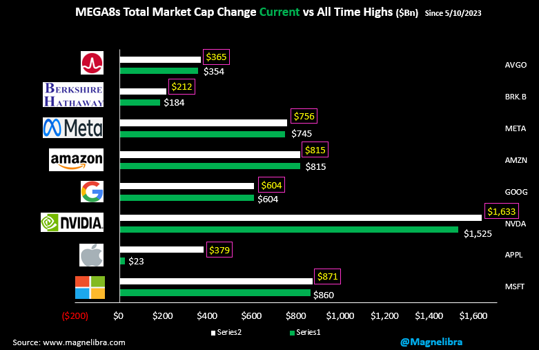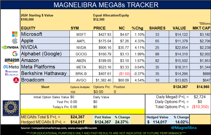 As far as the MEGA8s Tracker Broadcom (AVGO) was the big winner today and is intertwined with the big dogs as a chipmaker so this is one to watch and why all the news has been Nvidia, we think this one has been overlooked but has increased over 2x in the last year: