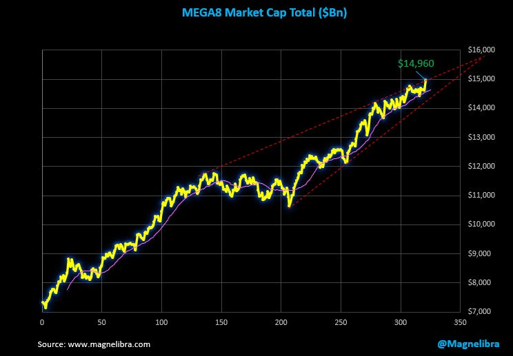 The tracker does not have a hedge this week and will continue to look to hedge this tracker to assist those that may utilize long only strategies. As many listeners know we like to use the QQQ to hedge this static long tracker and post the results daily, but for this week were targeting that 446C at 3.00 or better early on but never got there…As far as the market cap for the group, it hit new all time highs today a hair shy of $15Tn: