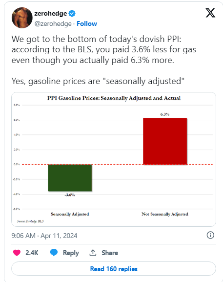 We also had PPI today which came in at a less than expected 0.2% MoM and YoY +2.1% expecting 2.2%. However all was defused of course by some more funny gimmickry which the BLS used a seasonal deflator to offset the increase in energy costs and as Zerohedge X account was correct to point out stating you actually paid 6.3% more for gas but the BLS told you you paid 3.6% less: